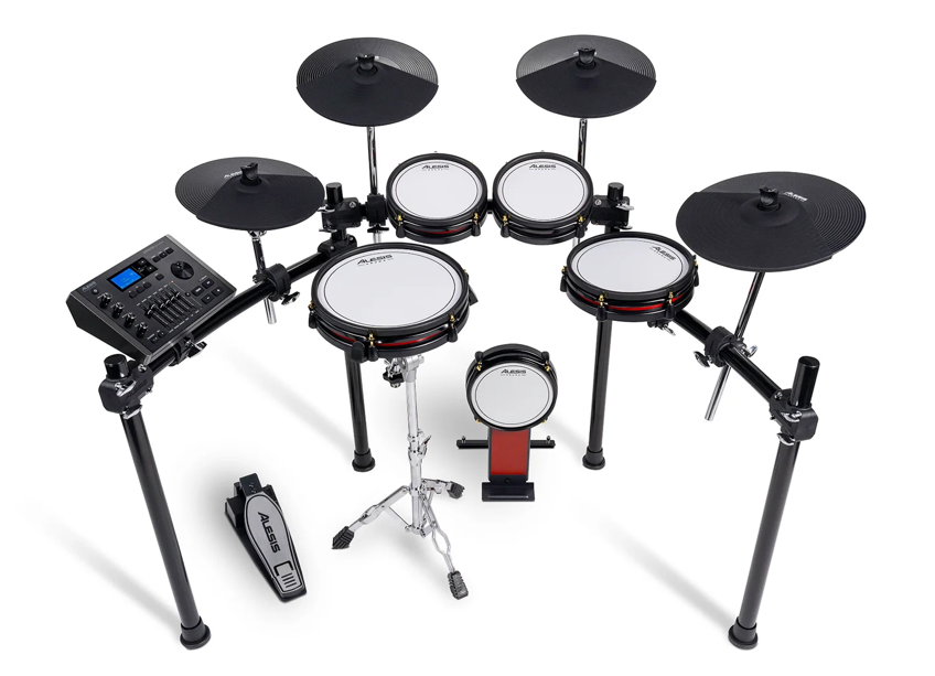 Kit de Bateria Electrónica de 9-Peças, 1 x Pad de Bombo de 8", 1 x Pad de tarola dual-zone de 12", 2 x Pads de Tom estéreo de 8", 2 x Pads de Tom estéreo de 10", 1 x Prato de Hi-Hat de 12" com controlador de Hi-Hat, 2 x Pads de Crash de 12" com função de Choke, 1 x Pad de prato de Ride de 14" de 3 zonas.
