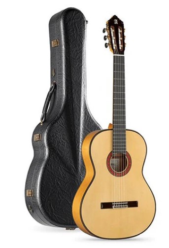 Tampo maciço em Abeto alemão, corpo em cipreste maciço, escala em ébano, protector transparente, Braço reforçado com Ébano, construção artesanal, Estojo incluído.