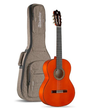 Tampo maciço em Abeto alemão, corpo em sicómoro, escala em ébano, envernizado em cor alaranjada forte, carrilhoes dourados. Inclui saco acolchoado (25mm) Alhambra.