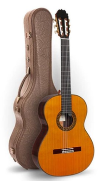 Guitarra clássica com tampo maciço em cedro, corpo em pau-santo da Índia maciço (largura de concerto), braço em cedro reforçado com ébano, escala em Ébano, carrilhões Schaller Grand Tune Classic Hauser, travessas estilo “Montcabrer”, acabamento lacado com laca nitro.