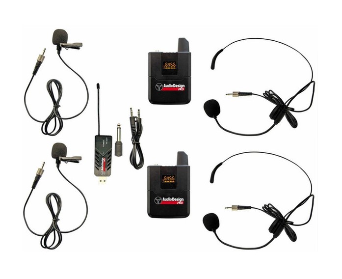 Sistema sem fios duplo em banda UHF com 2 microfones de cabeça e lapela (uso alternativo), e um receptor com conexão USB para ligação directa a computador, além de ter uma saída audio jack 3.5 para ligação a uma mesa de mistura ou coluna amplificada. Inclui cabo jack 3.5/jack 3.45 e adaptador jack 6.3.