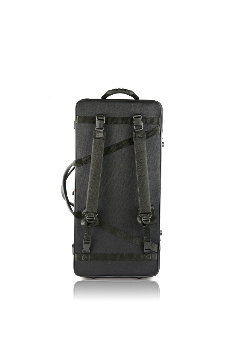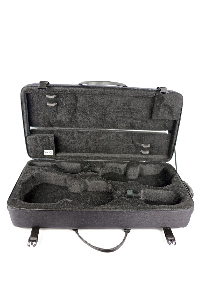 Estojo para violino + viola, peso 3,4kg, dimensões de cada instrumento: violino com comprimento 61cm, largura 39cm e viola com comprimento 73,5cm e largura 41,5cm. Estrutura em espuma de polioretano de alta densidade para maior protecção contra diferenças de temperatura, tubo de cordas, 2 compartimentos para acessórios, 4 apoios de arco. Revestimento exterior em Cordura impermeável, bolsa exterior expansível, 2 correias de ombro ajustáveis e removíveis com almofada, asa lateral.