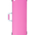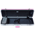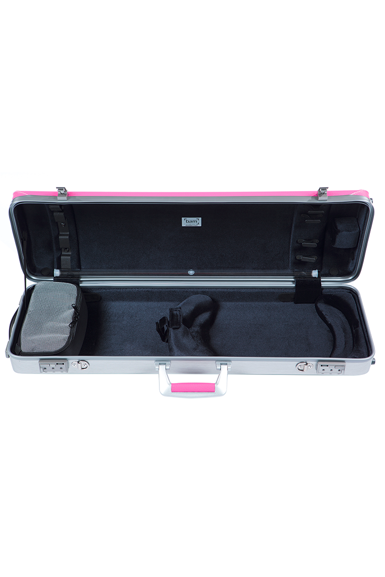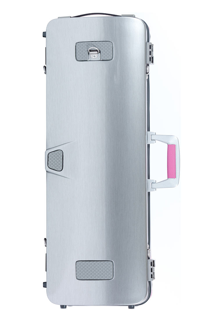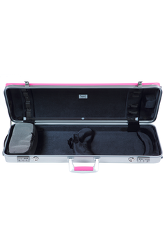 Estojo de violino com tampa superior em pele e tampa inferior em alumínio escovado. Cor rosa