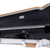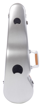 Estojo de violino com tampa superior em pele e tampa inferior em alumínio escovado. Cor cognac.