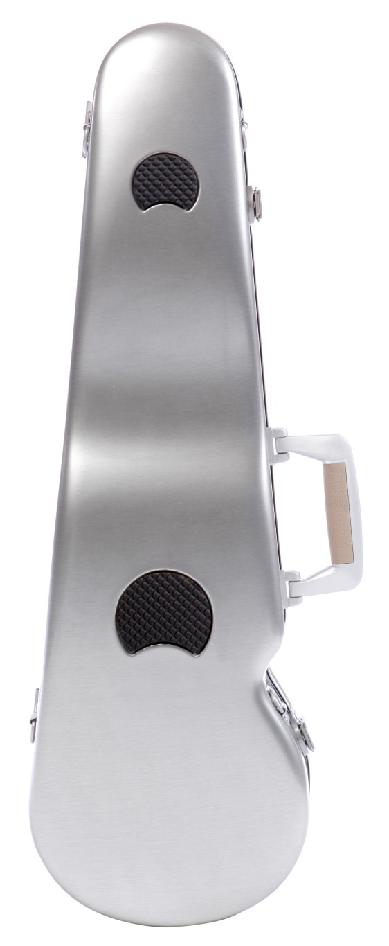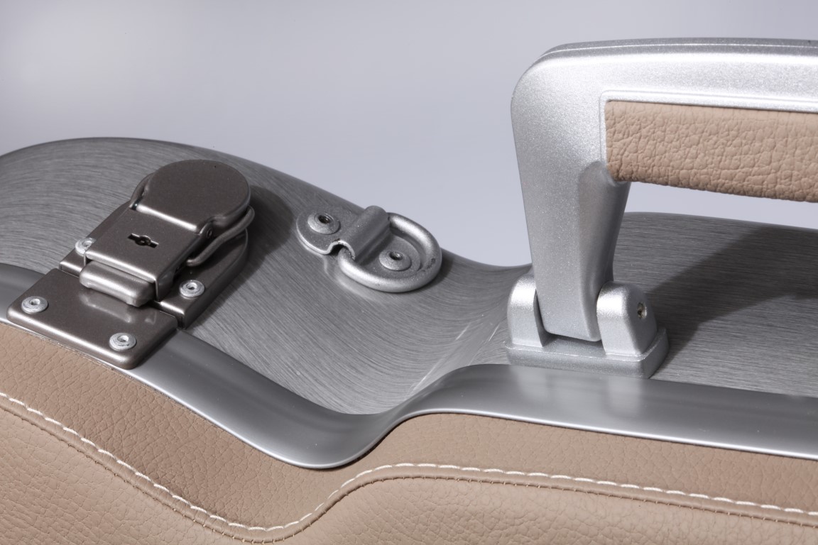 Estojo de violino com tampa superior em pele e tampa inferior em alumínio escovado. Cor beige.