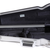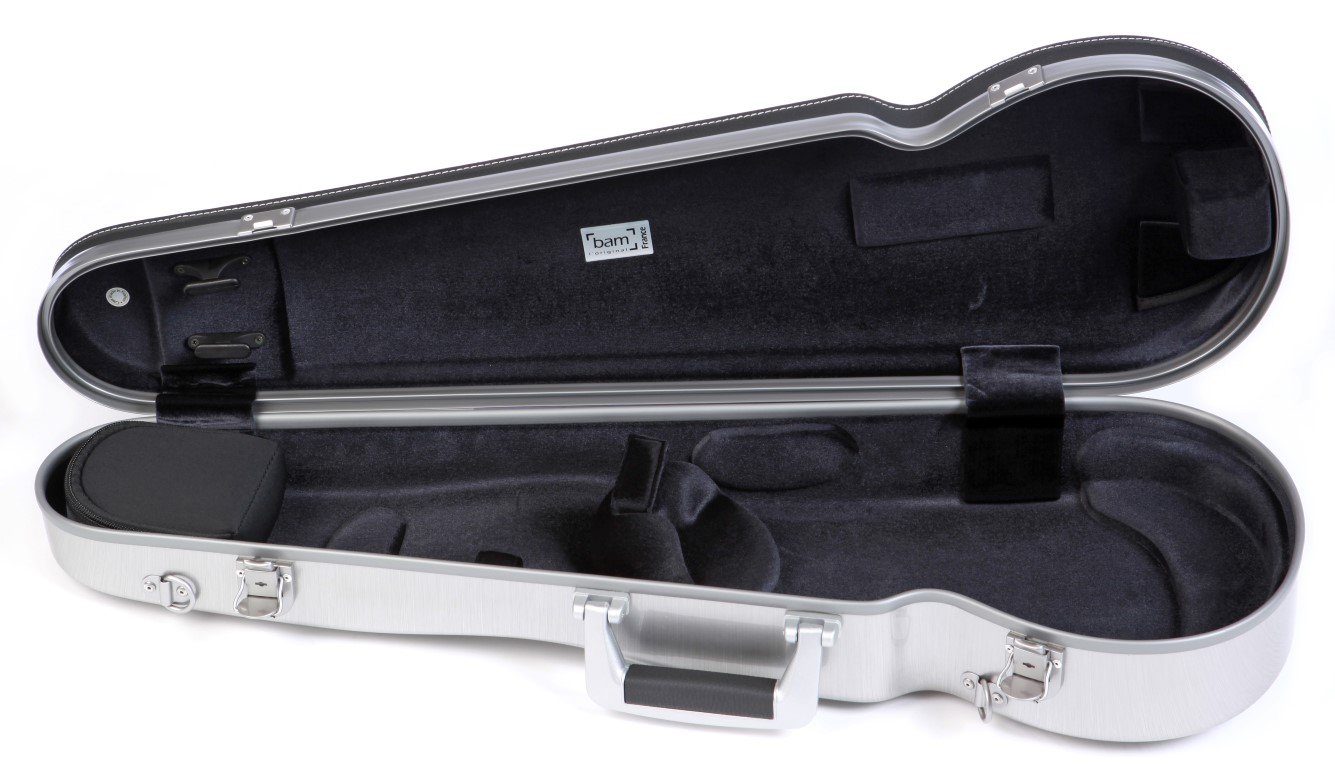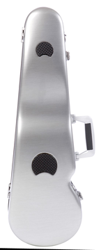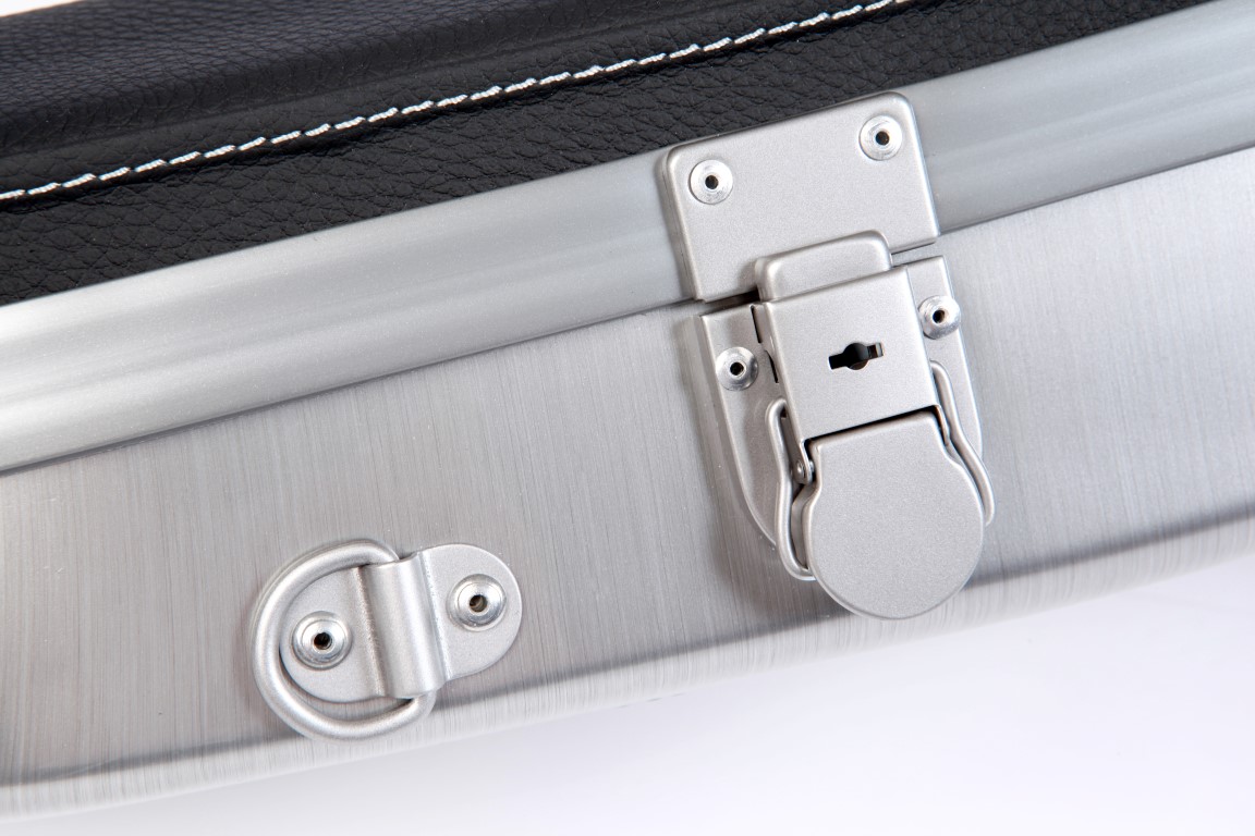 Estojo de violino com tampa superior em pele e tampa inferior em alumínio escovado. Cor preta.