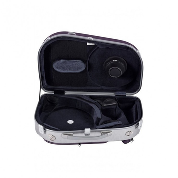 Estojo para Trompa da série Hightech. Estrutura tripla Hightech: ABS, Airex e ABS, duas alças antiderrapantes de neoprene com mosquetões de segurança, duas fechaduras, alça lateral confortável, pés de borracha antiderrapantes. Parte superior em pele, parte inferior em alumínio escovado. Almofada traseira com duas bolsas com espaço para dois bocais e partituras. Interior em espuma de poliuretano de alta densidade. Dois espaços para bocais, compartimento para surdina. Bolsa interior extraível.