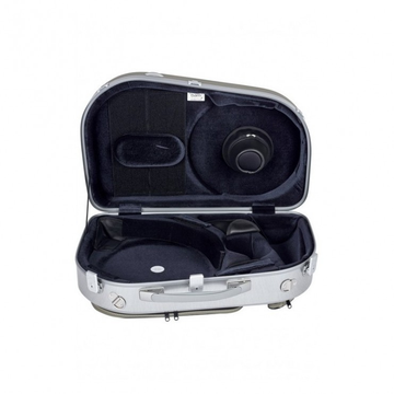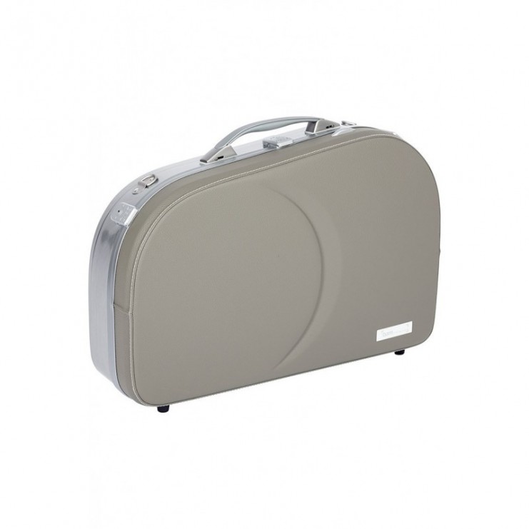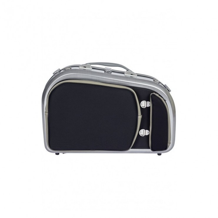 Estojo para Trompa da série Hightech. Estrutura tripla Hightech: ABS, Airex e ABS, duas alças antiderrapantes de neoprene com mosquetões de segurança, duas fechaduras, alça lateral confortável, pés de borracha antiderrapantes. Parte superior em pele, parte inferior em alumínio escovado. Almofada traseira com duas bolsas com espaço para dois bocais e partituras. Interior em espuma de poliuretano de alta densidade. Dois espaços para bocais, compartimento para surdina. Bolsa interior extraível.