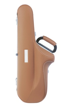 Estojo para saxofone Alto com tampa e base cobertas com pele natural. Tem duas correias acolchoadas tipo mochila e extraíveis, asa lateral, duas fechaduras BAM com chave.
