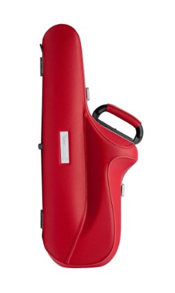 Estojo para saxofone Alto com tampa e base cobertas com pele natural. Tem duas correias acolchoadas tipo mochila e extraíveis, asa lateral, duas fechaduras BAM com chave.
