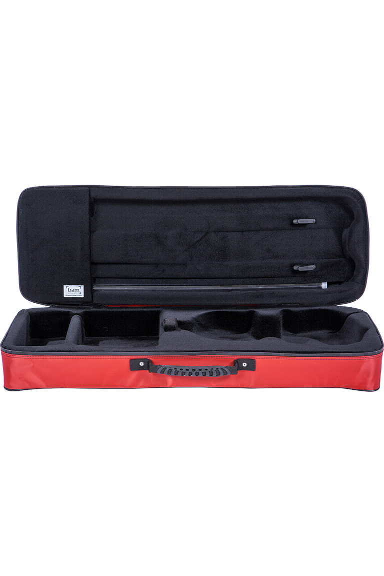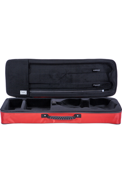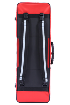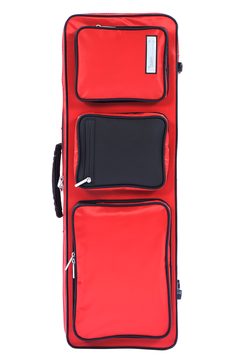 Estojo de violino rectangular, tipo mochila ajustável para trolley. Interior com espuma em poliuretano de alta densidade. Fechos impermeáveis. Cor vermelha.