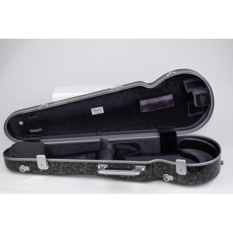 Estojo para violino da série Hightech. Estrutura tripla Hightech: ABS, Airex e ABS, duas alças antiderrapantes de neoprene com mosquetões de segurança, duas fechaduras com chave, alça lateral confortável, pés de borracha antiderrapantes. O instrumento fica totalmente suspenso no seu interior em almofadas de espuma. 2 Suportes para arco, correia para almofada tipo Kun. Bolsa interior extraível .