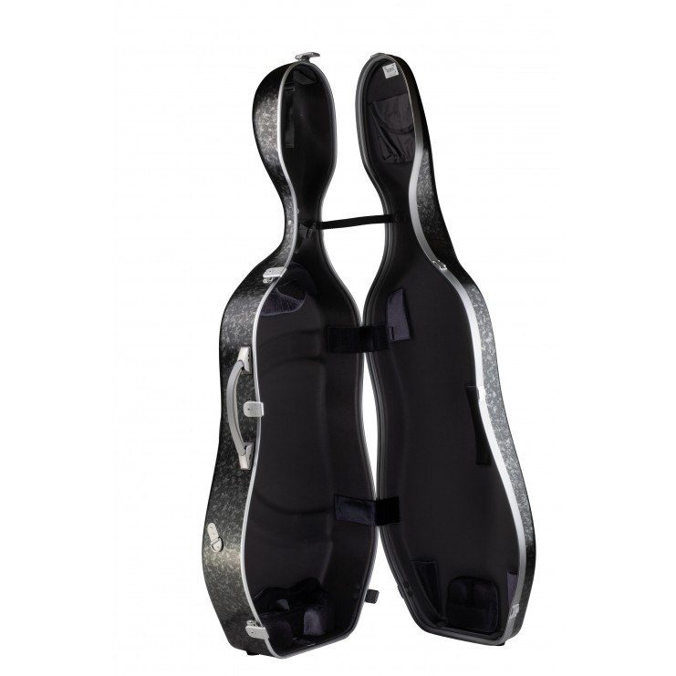 Estojo para violoncelo da série Hightech. Estrutura tripla Hightech: ABS, Airex e ABS, duas alças antiderrapantes de neoprene com mosquetões de segurança, cinco fechaduras com chave, alça lateral confortável, pés de borracha antiderrapantes. O instrumento fica totalmente suspenso no seu interior em almofadas de espuma. 2 Suportes para arco. Bolso interior para partituras.