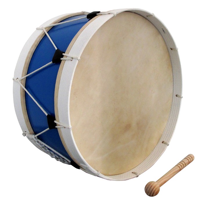 Bombo tradicional em madeira, com pele natural e uma maceta. Fabrico nacional. Acabamento azul.