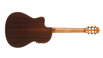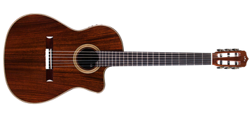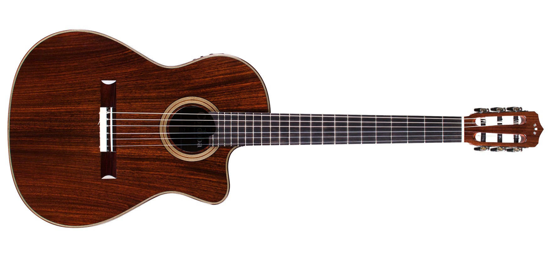 Guitarra classica espanhola electrificada, tampo, fundo e laterais em Rosewood maciço, braço e escala em Mogno, ponte em Rosewood, carrilhões prateados, acabamento brilho, pickup activo com equalizador 2 bandas, cordas Savarez 500CJ tensão alta e saco deluxe.