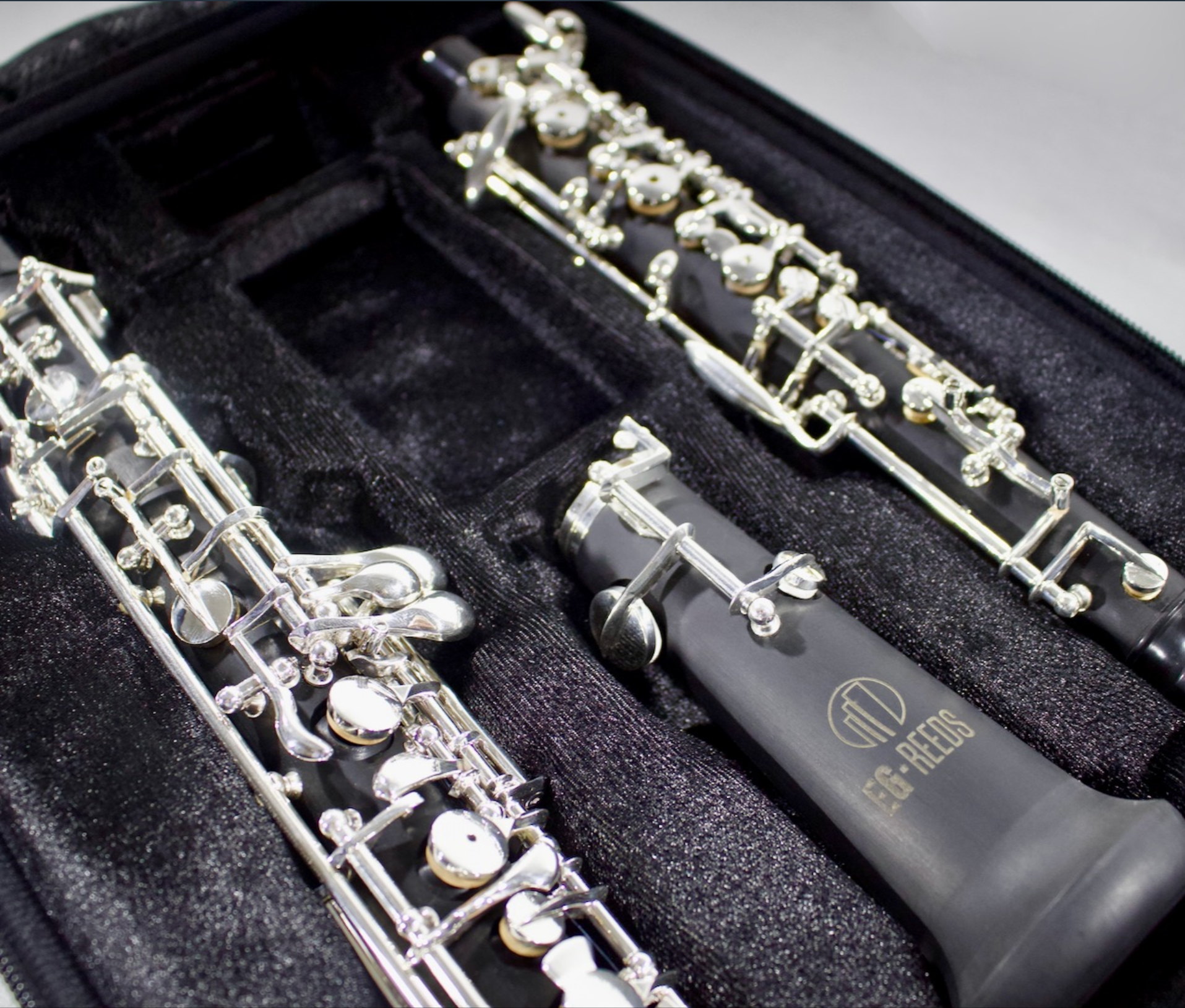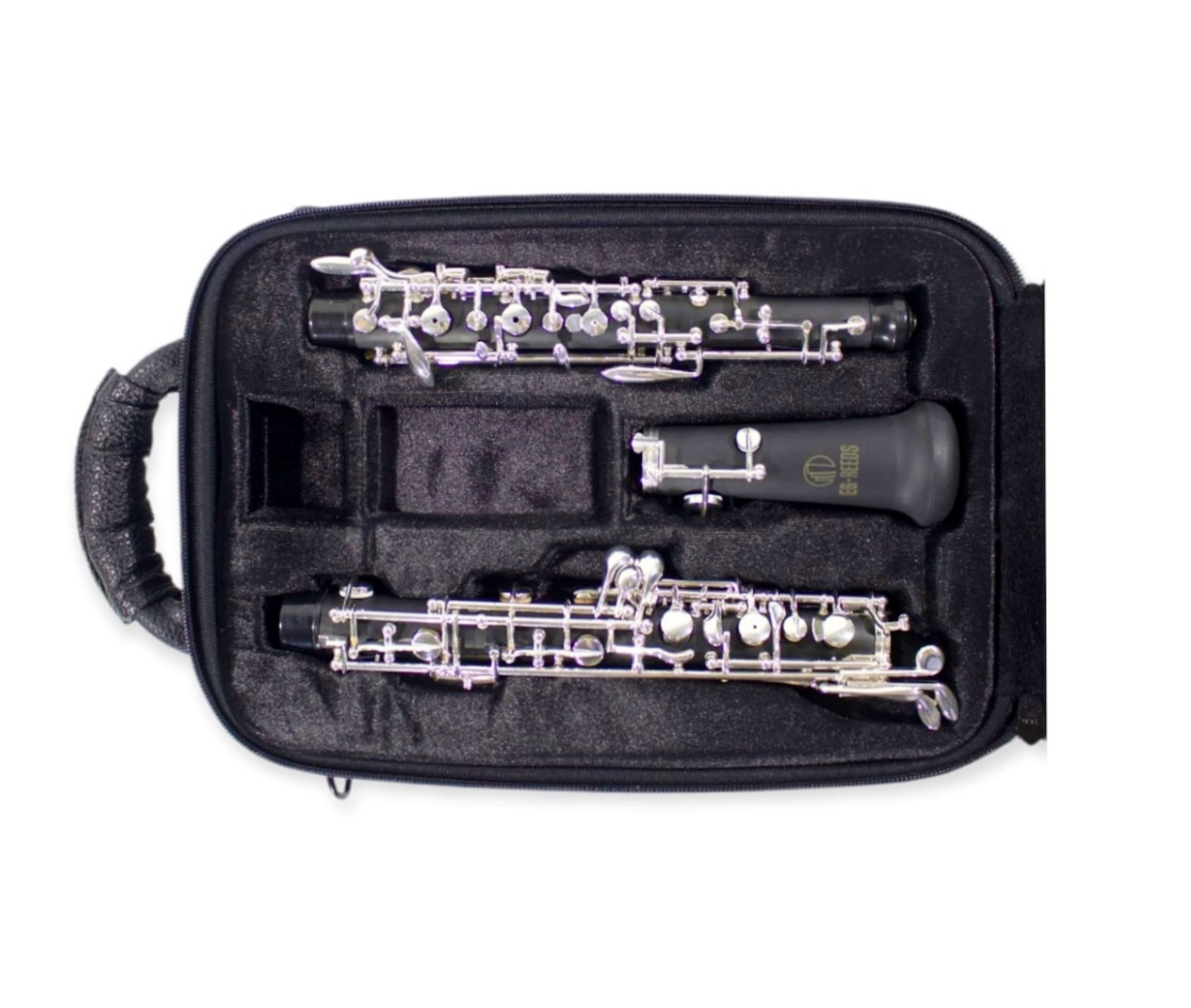Oboé semi-profissional intermédio. Semi-automático. Oboé em compósito (mistura de madeira e ABS). Sistema Conservatório Completo. Chaves Prateadas. Inclui estojo, palheta de estudante intermédia, escovilhão, pano de limpeza e graxa para cortiça.