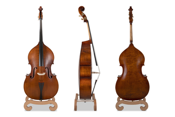 Contrabaixo em forma Violino, tampo maciço em Aeto, aros e fundo laminados, filetes embutidos, cravelhas individuais em latão, escala em ébano, envernizamento ligeiro à mão castanho escuro estilo antigo.Não inclui arco nem saco ou estojo. Setup efetuado em Luthier na Alemanha.