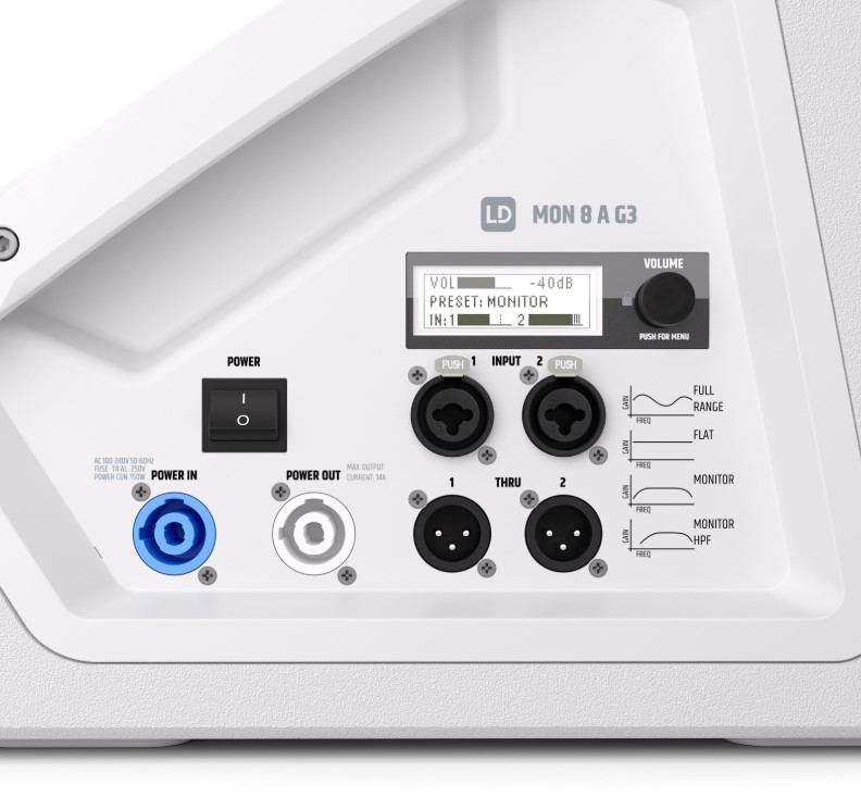 Tanto o sinal de áudio (conetor combo XLR/jack) como a alimentação elétrica (compatível powerCON) podem ser ligados em loop, permitindo uma distribuição de cabos limpa e organizada em instalações multimonitor ou de reforço sonoro distribuído.