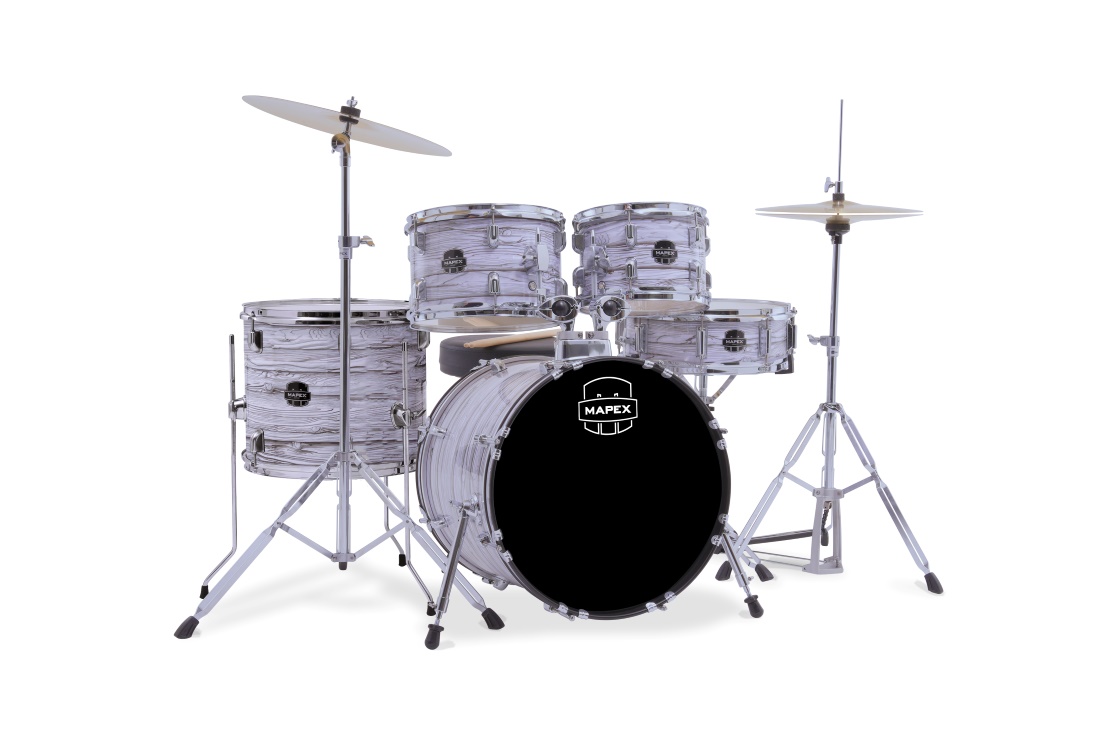 Kit composto por bombo de 22", Toms 10+12+16, tarola 14, 1 suporte de prato, suporte tarola, suporte choques, pedal de bombo, banco, não inclui pratos