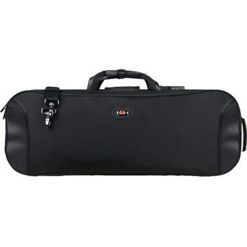 Estojo Rectangular Violino, interior de veludo de cor vinho, compartimento para quatro arcos, higrómetro, humidificador. Exterior com cadeado. Correia para os ombros.