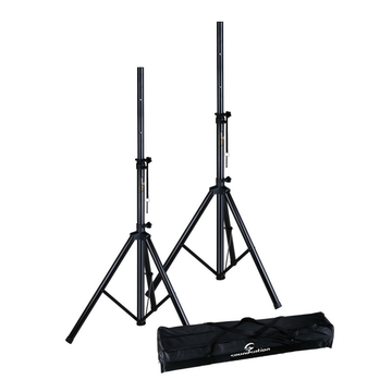 Kit de 2 suportes de coluna em aço, com saco de transporte. Tudo de 35mm de diâmetro, altura máxima 1.80m, acabamento preto, para colunas até 40kg.