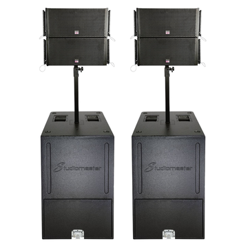 Sistema de som amplificado composto por 2 x 18” subwoofers e 2 x 10” tops. 2800W de potência com amplificação class D, 2 entradas e 4 saídas, DSP, ligação LAN.