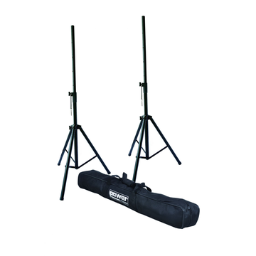 Kit de 2 suportes de coluna em aço de grande resistência e baixo peso, com saco de transporte. Tudo de 35mm de diâmetro, travão de segurança, altura máxima 2.40m, acabamento preto.