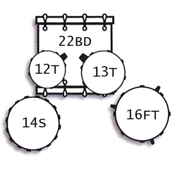 Kit completo que inclui bombo 22x16";, timbalões suspensos 12x9"; e 13x10";, timbalão de chão 16x16"; e tarola 14x5.5";, peles Remo UT, Aros do bombo em madeira, Hardware (Suporte prato girafa, suporte choques, suporte tarola, banco, pedal de bombo), pratos (choques 14"; e crash 16";) e baquetas 5A.