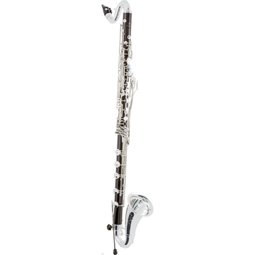 Clarinete baixo em Si bemol, sistema francês, corpo em Granadilha selecionada, registo até Dó grave, chave sol de ressonância, alavanca Mib/Láb, tudel, campânula e chaves prateadas.