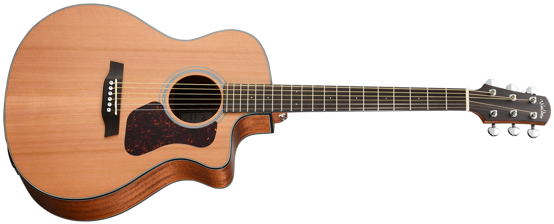 Guitarra electroacústica com tampo Cedar sólido, fundo e ilhargas Mahogany laminado, braço Mahogany reforçado c/ fibra de vidro, escala e cavalete Rosewood, pestana GRAPH TECH NuBone, roseta/ binding em decal/Plástico ABS Preto, truss rod Two-Way, carrilhões Die-Cast cromados, pickguard Faux-tortoise shell, pickup 'WALDEN Active' EQ & tuner, acabamento UV cured PE - Open Pore Satin Finish, cordas D'ADDARIO EXP11.