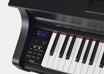 | Teclado | 88 teclas contrapesadas com ação de martelo Grand Touch-S, teclas brancas em madeira, superfícies em ébano e marfim sintéticos, simulação de escape |